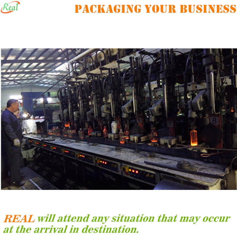 The most widely used forming machine arrangement is the individual section machine (or IS machine). This machine has a bank of 5-20 identical sections, each of which contains one complete set of mechanisms to make containers. The forming machines hold and move the parts that form the container. Generally powered by Electric power and compressed air, the mechanisms are timed to coordinate the movement of all these parts so that containers are made. At REAL FLINT Glass , two primary methods of making a glass container — the blow and blow method and the press and blow method are followed. In both cases a stream of molten glass, at its temperature (1050°C-1200°C), is drawn from the spout bowl through Orifice Ring Punched through Refractory plungers and cut with a shearing blade to form a weighed Drop of glass, called a gob. Both processes start with the gob falling with gravity to the Scoops and distribute to the section through Trough and Deflectors, , into the blank molds to form a pre shape of the bottle is called Parison and then the Parison passes into the Blow section to Form a complete shape of the Bottle with Final blow and Finish cooling In the blow and blow process. In the Press and blow Process drop of glass Pushed from the metallic Plunger and make a pre shape bottle (parison) and flip into the blow side for the final blow and finish cooling to complete shape of bottles. The bottle then passes through the main conveyor transfer to the cross conveyor and transfer unit to the Annealing Line for the Annealing Purpose .